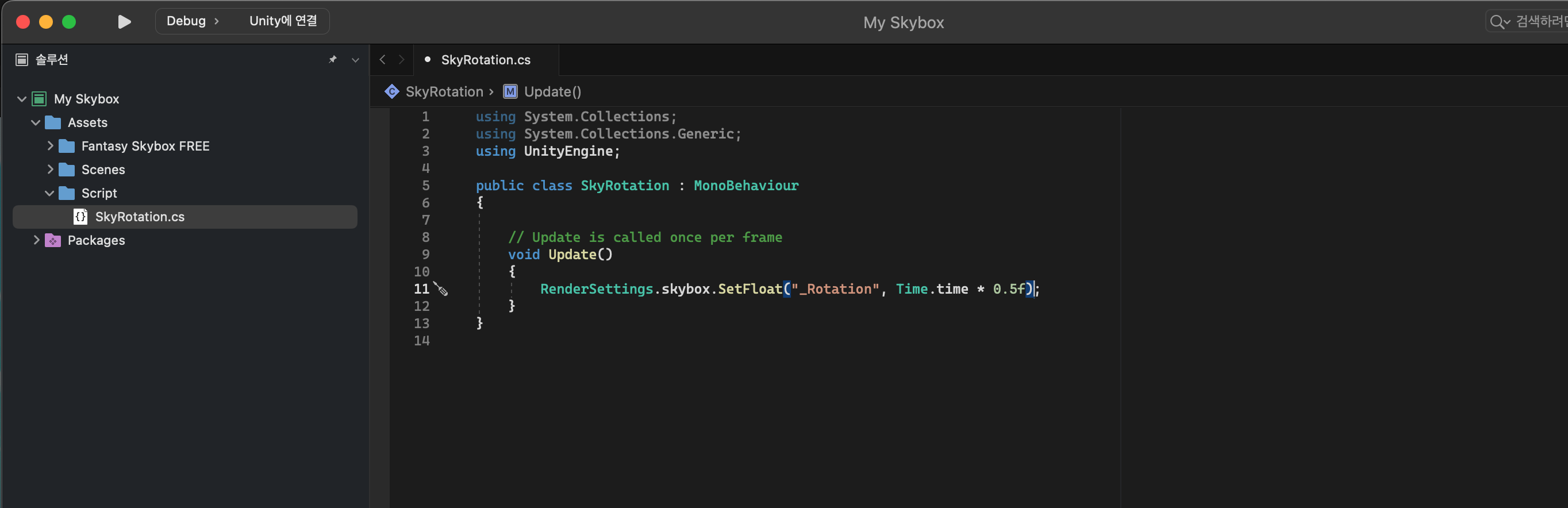 RenderSettings.skybox.SetFloat("_Rotation", Time.time * 0.5f);