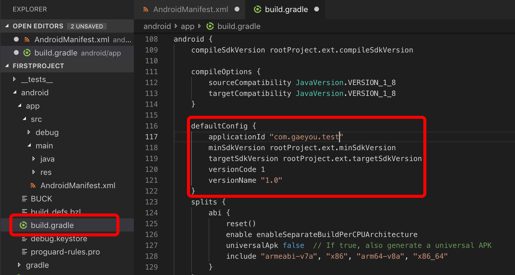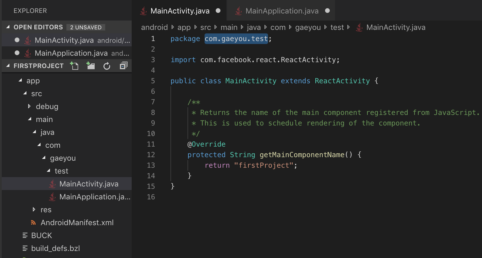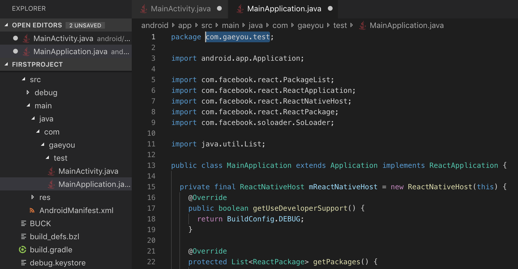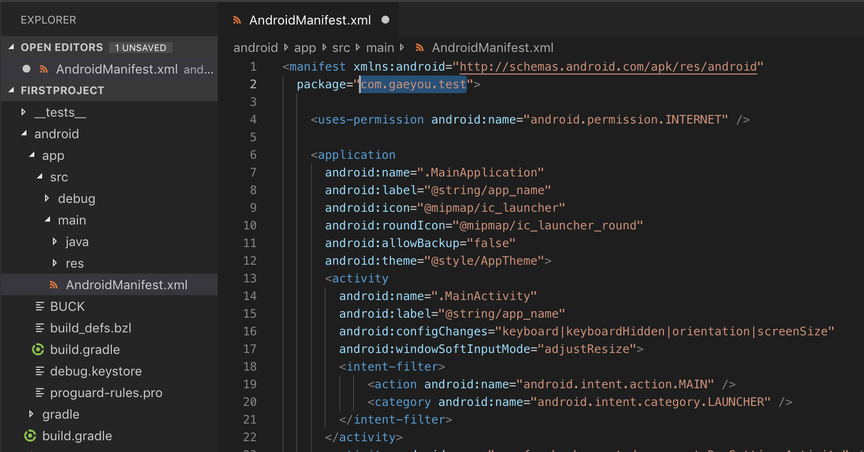 /android/app/src/main/AndroidManifest.xml 파일을 열어보면 Package명이 com.firstproject로 지정되어 있습니다.