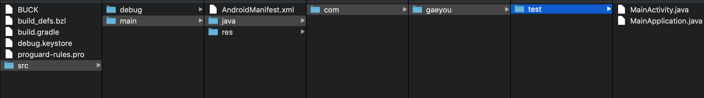 /android/app/main/java/com/gaeyou/test 폴더 구조로 변경합니다.