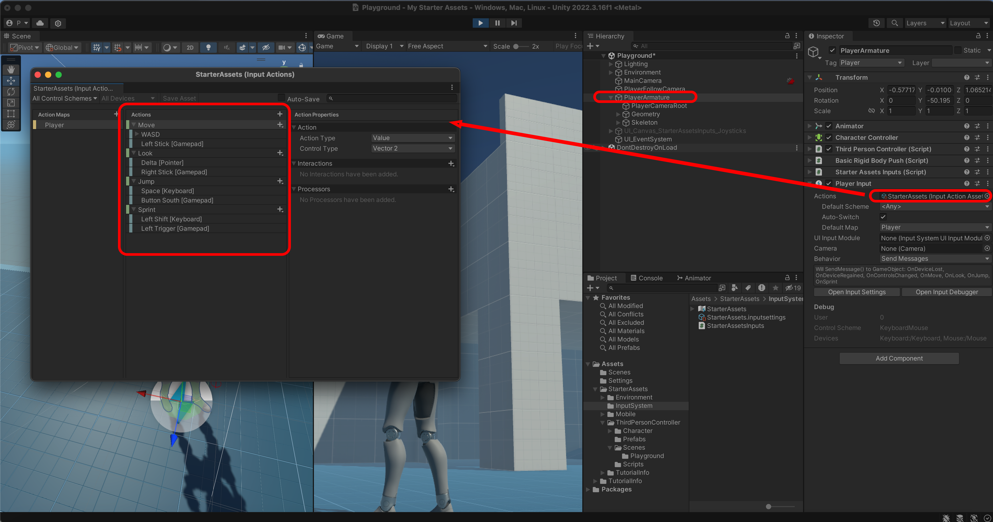 Player Input을 추가하고 StarterAssets를 연결합니다.