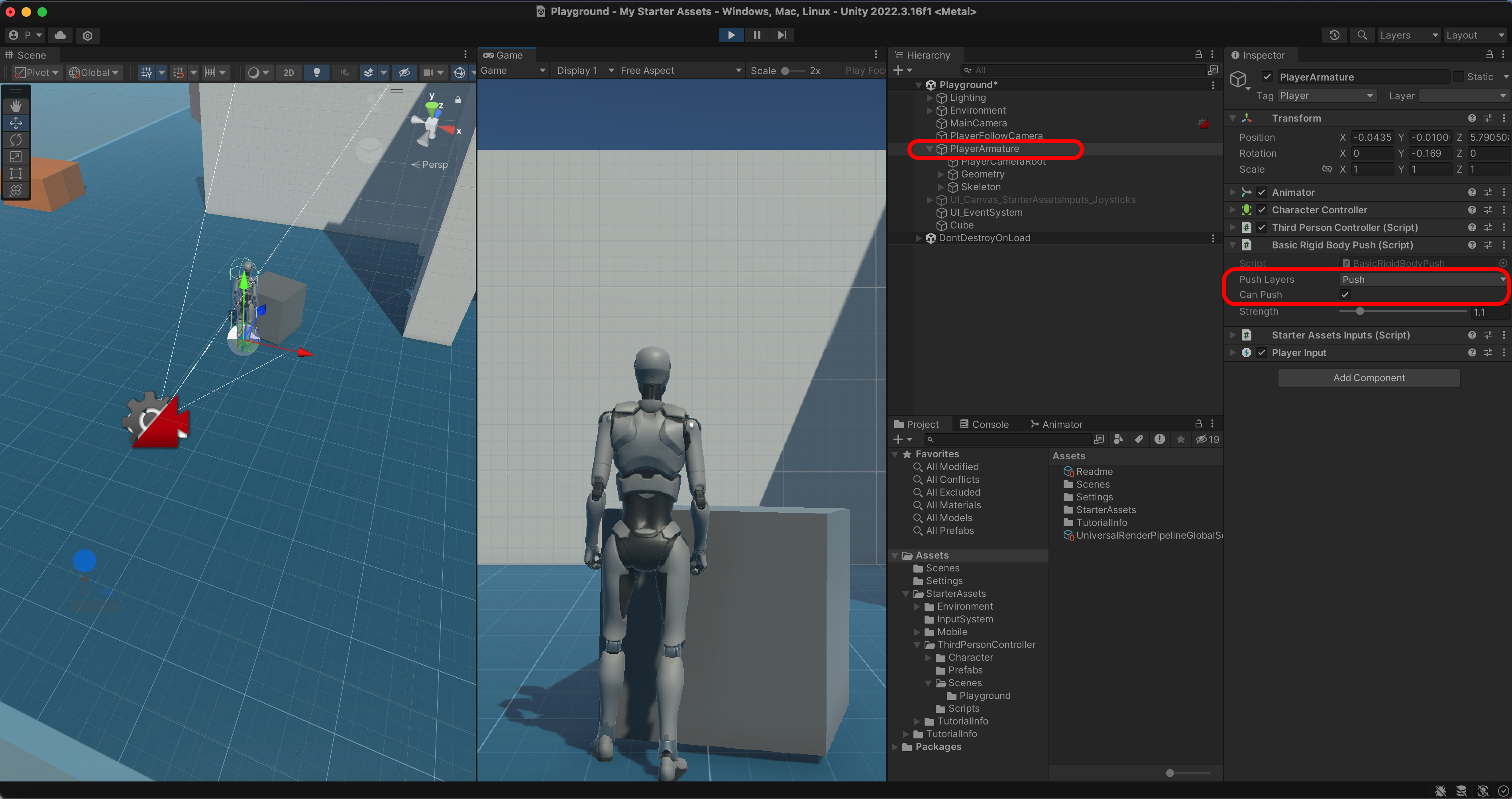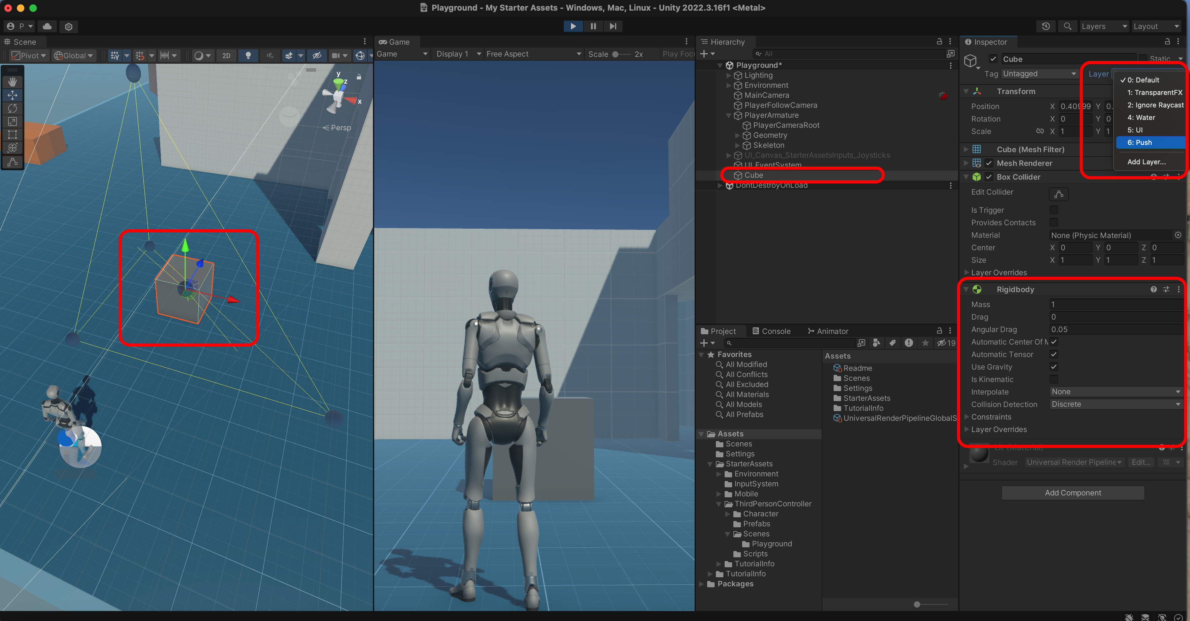 PlayerArmature의 Basic Rigid Push에서 Layer를 Push로 바꾸고 CanPush를 체크하면 Cube를 밀수 있습니다.