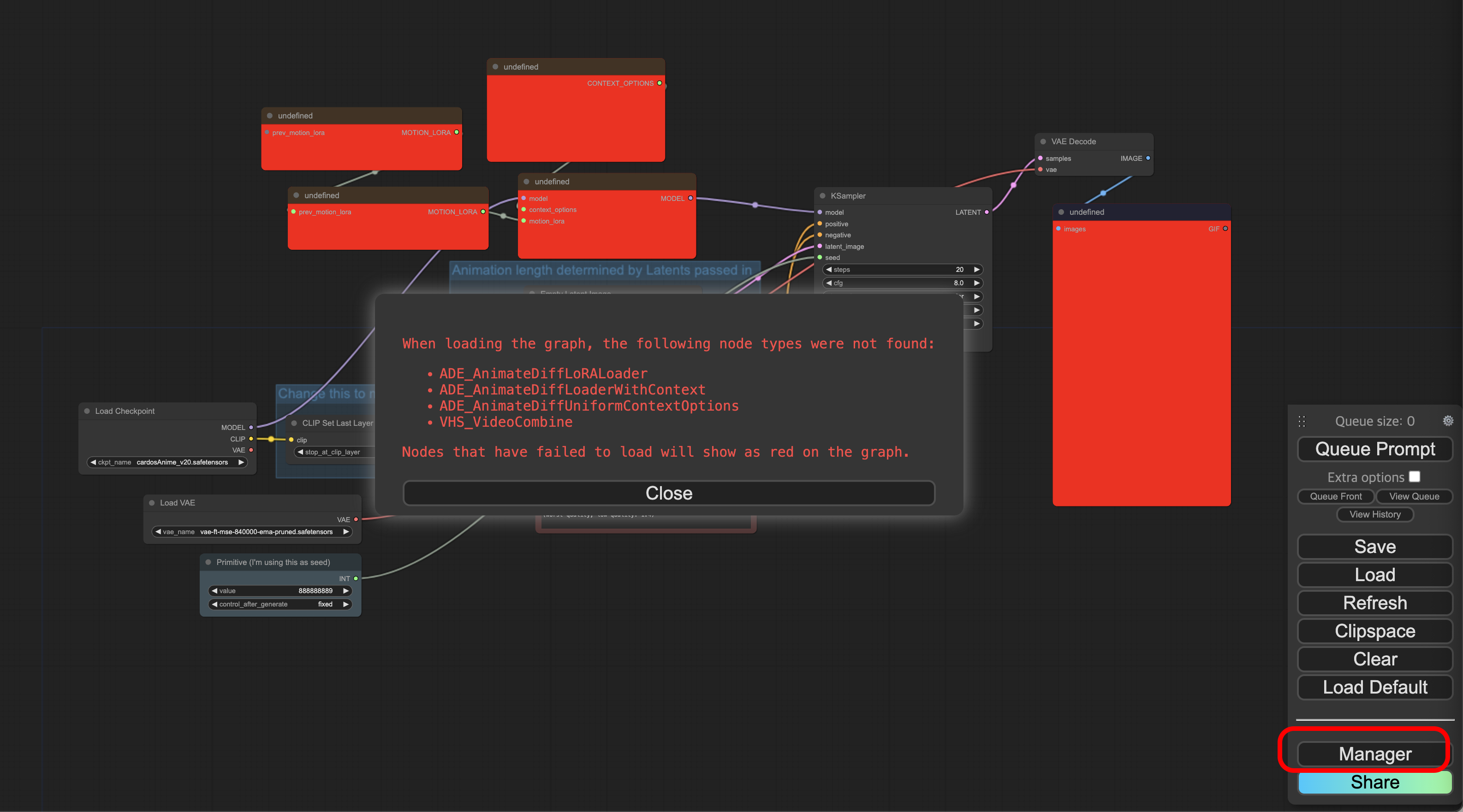 Manager > Install Missing Custom Nodes에서 누락된 노드를 설치합니다.