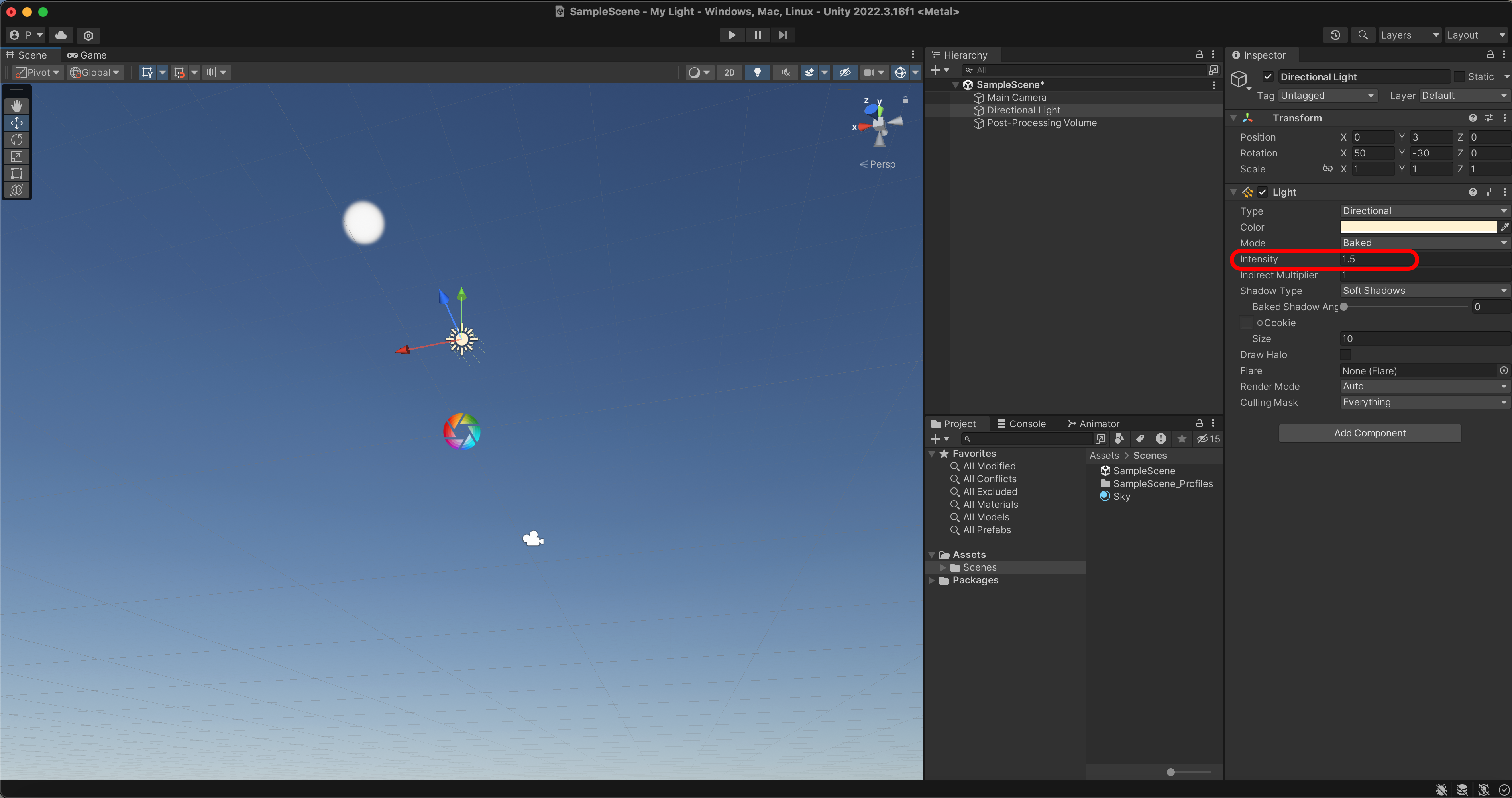 intensity를 1.5로 조절해서 태양의 밝기를 조절할수 있습니다.