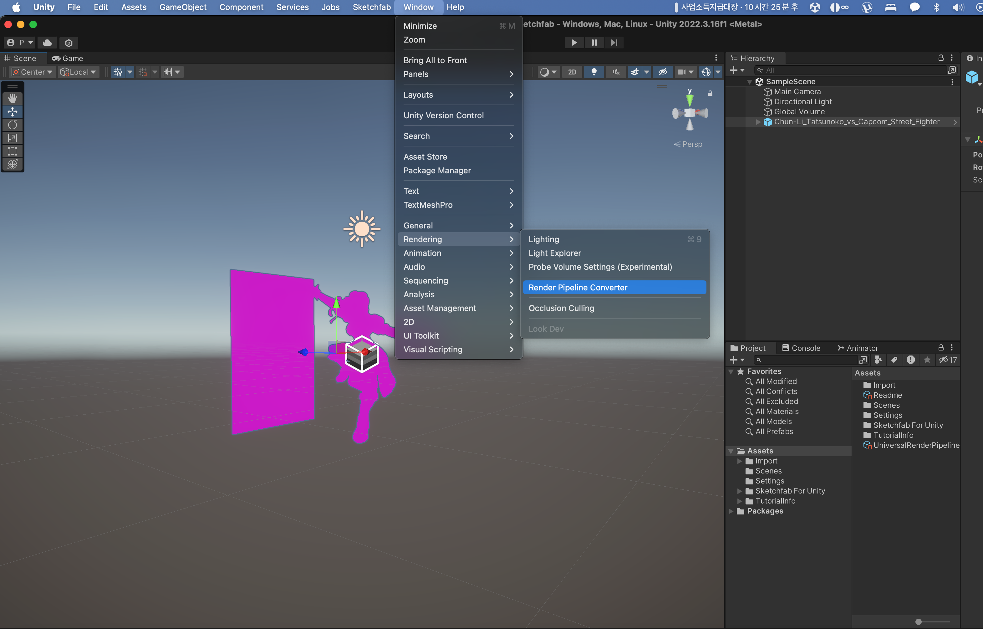 분홍색으로 import되면 Render Pipeline Converter를 실행합니다.