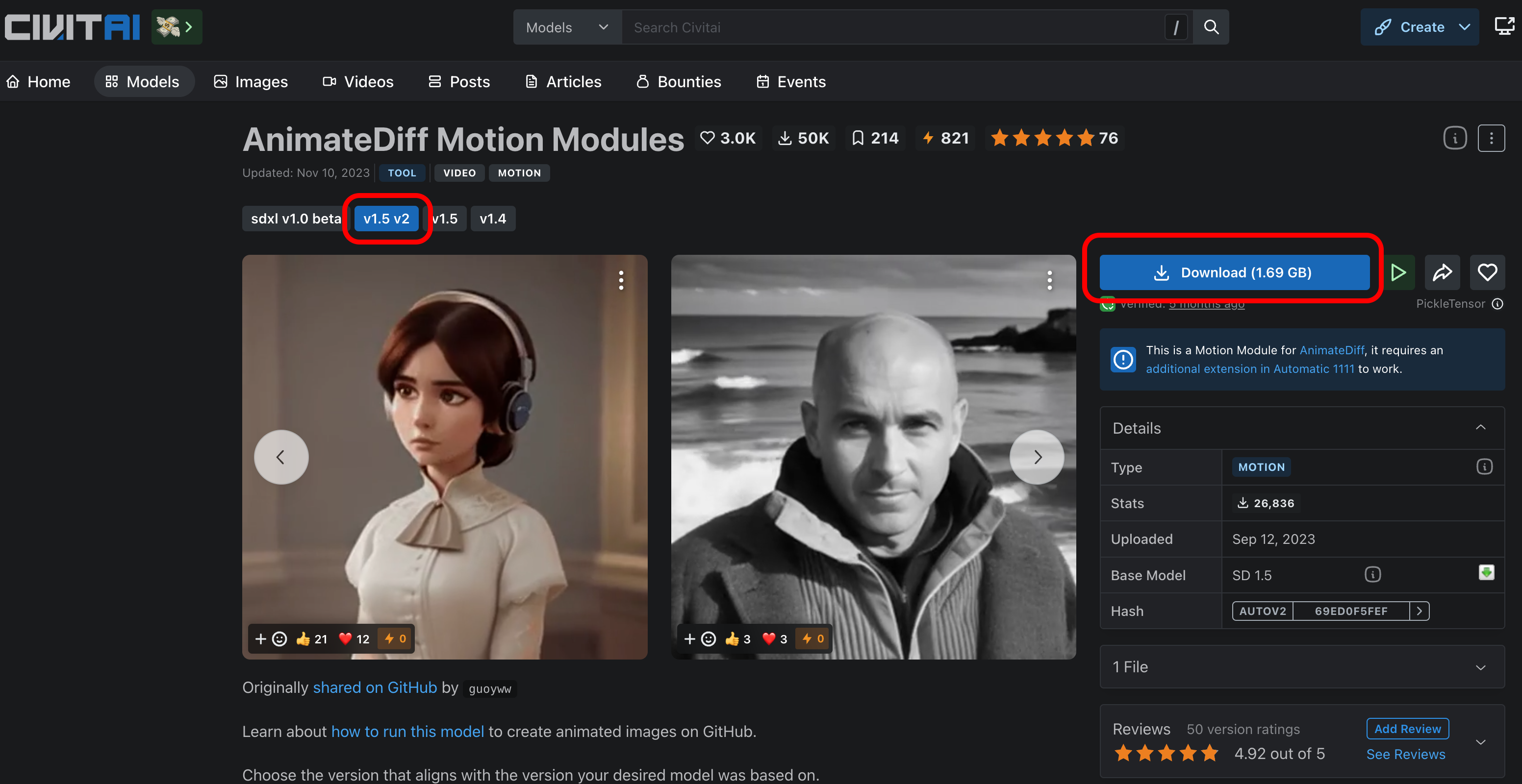 위사이트에서 Motion Modules를 다운로드해서 extends/sd-webui-animatediff/model에 넣어줍니다.