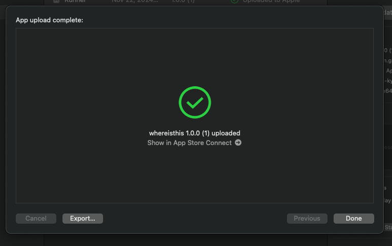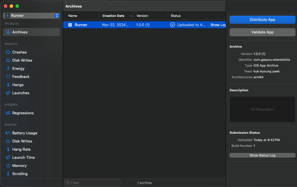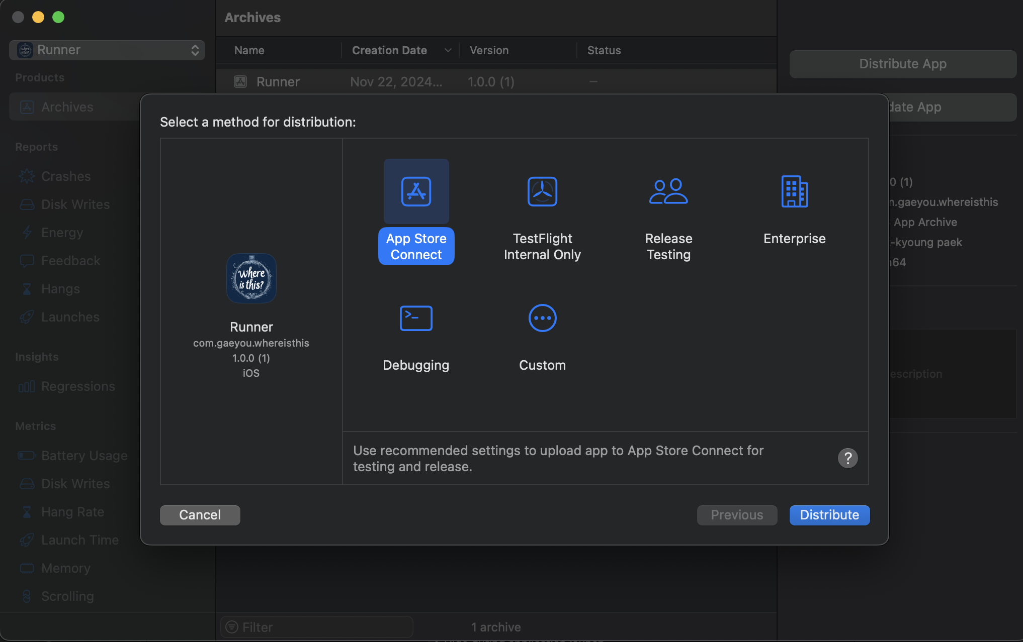 version과 build를 선택하고 Distribute App을 누릅니다.