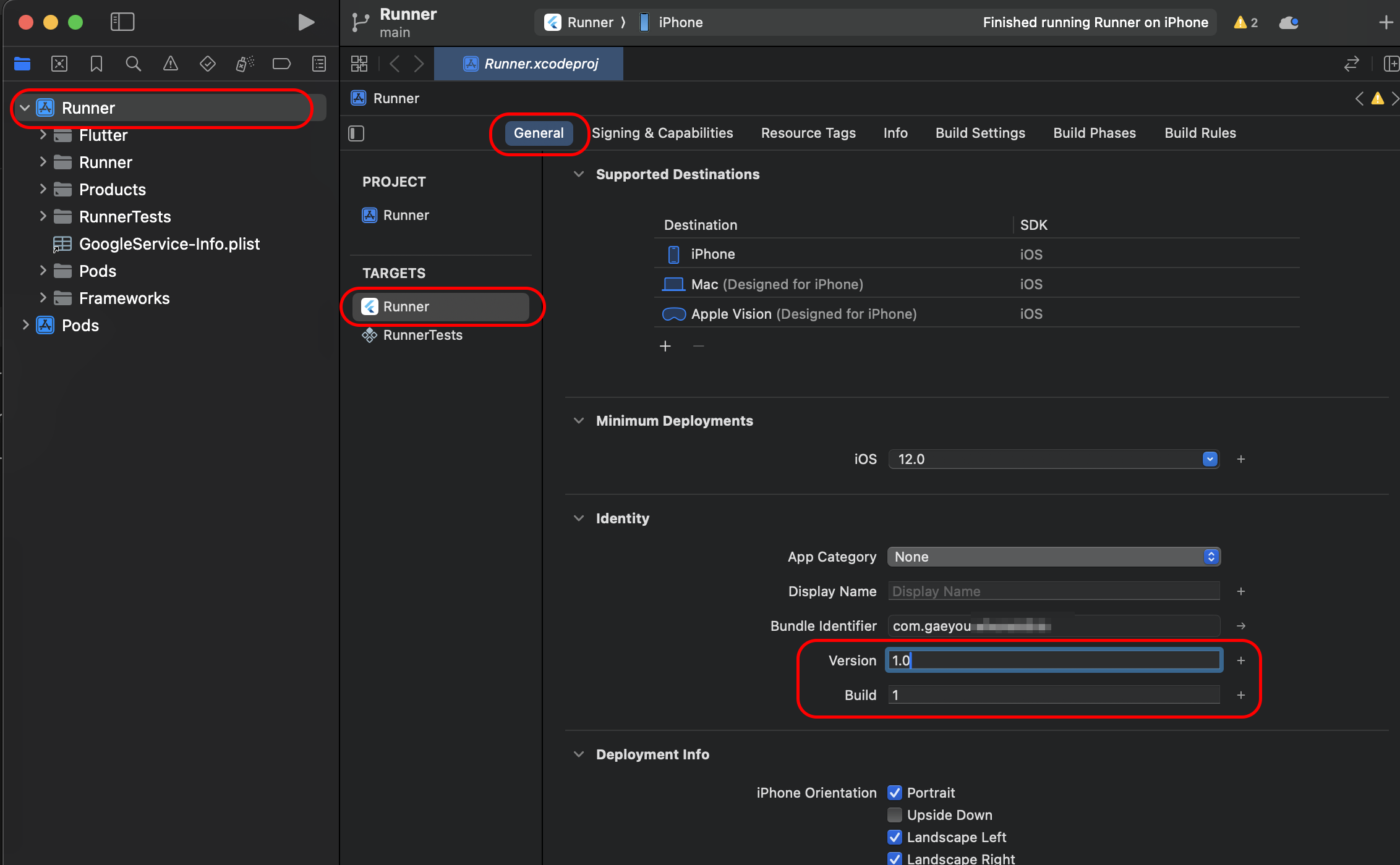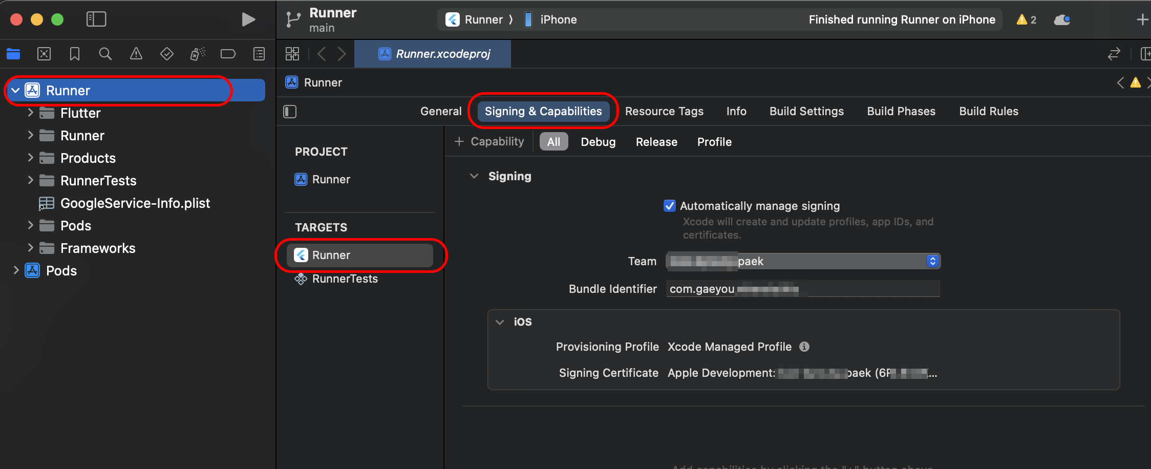 Xcode에서 Team과 Bundle Identifier를 확인합니다.