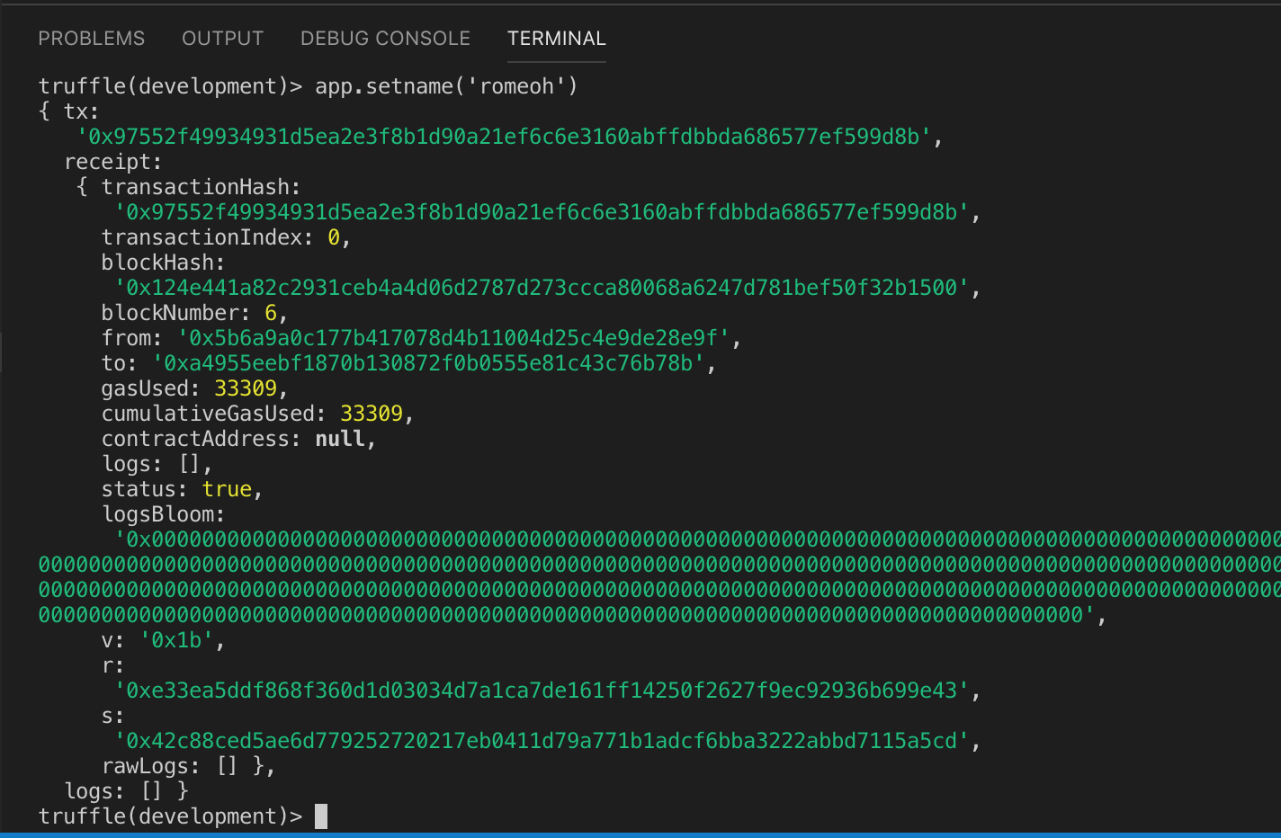 truffle(development)> app.setname('romeoh')