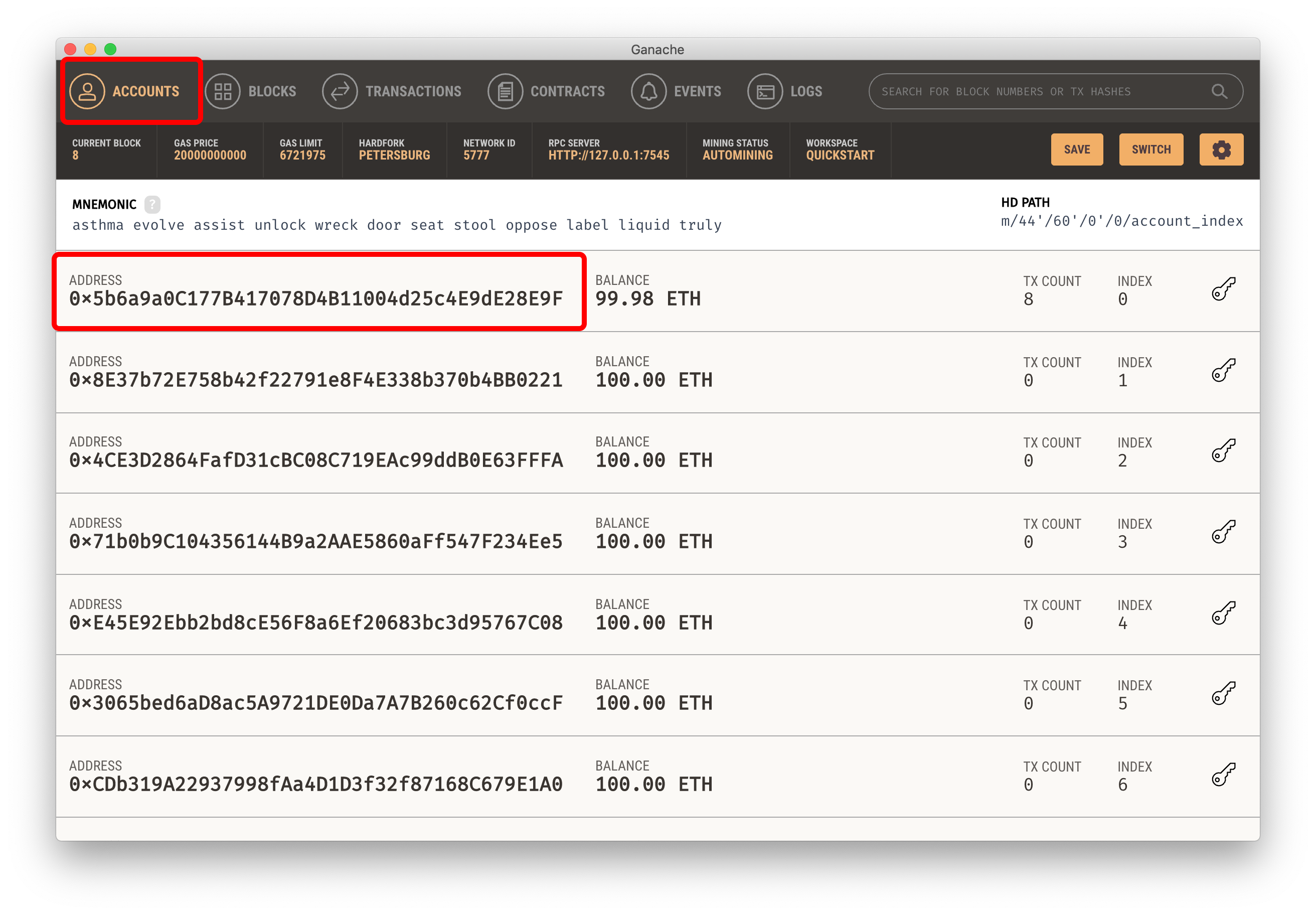 Accounts 메뉴에 가시면 해당 계정에 deploy를 하면서 소진한 Gas 값이 일부 차감된 것을 확인 할 수 있습니다.