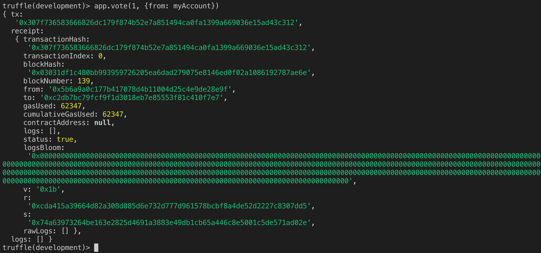 투표를 위해서 62347 gas가 소모된 것을 확인 할 수 있습니다.