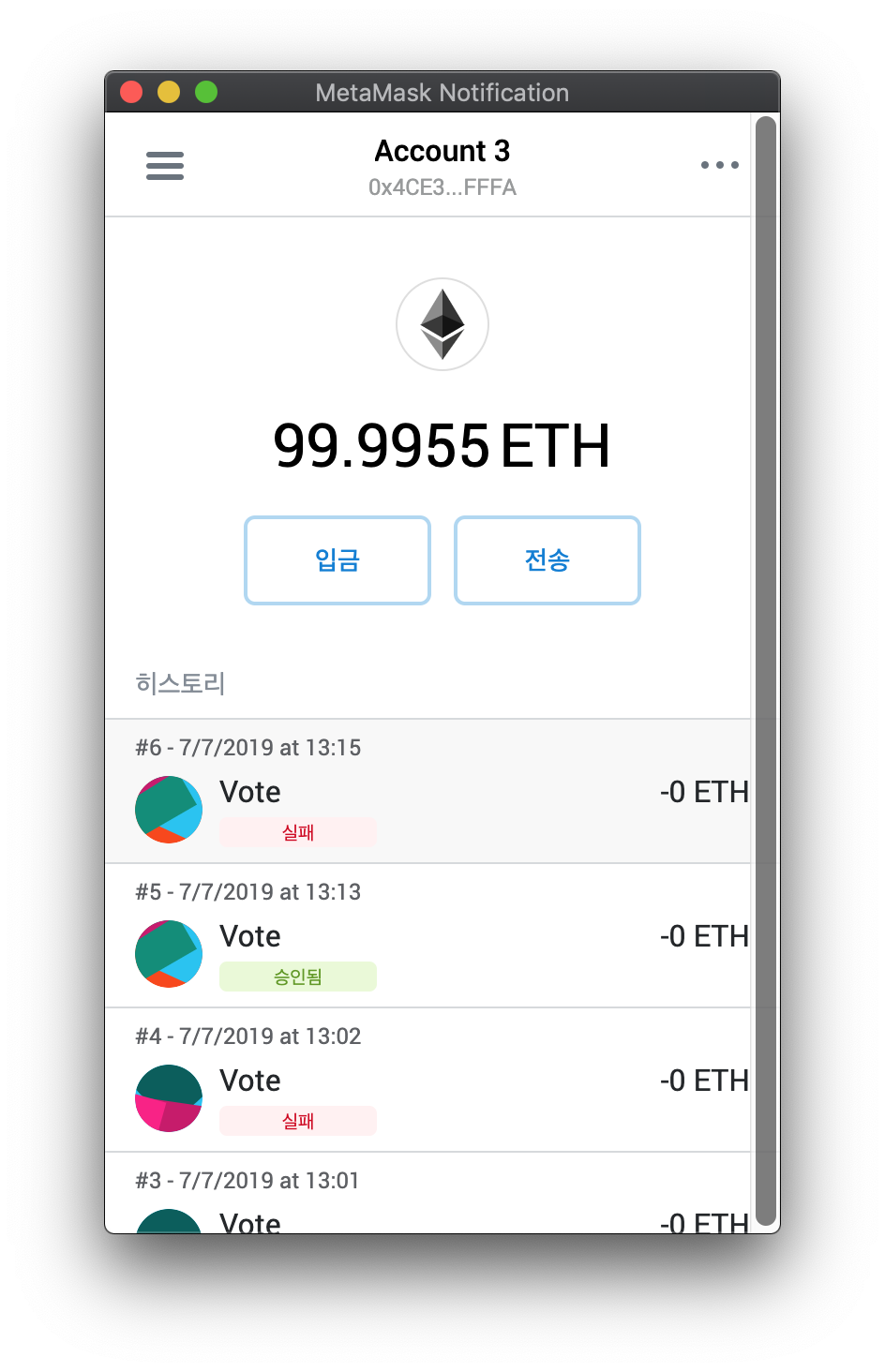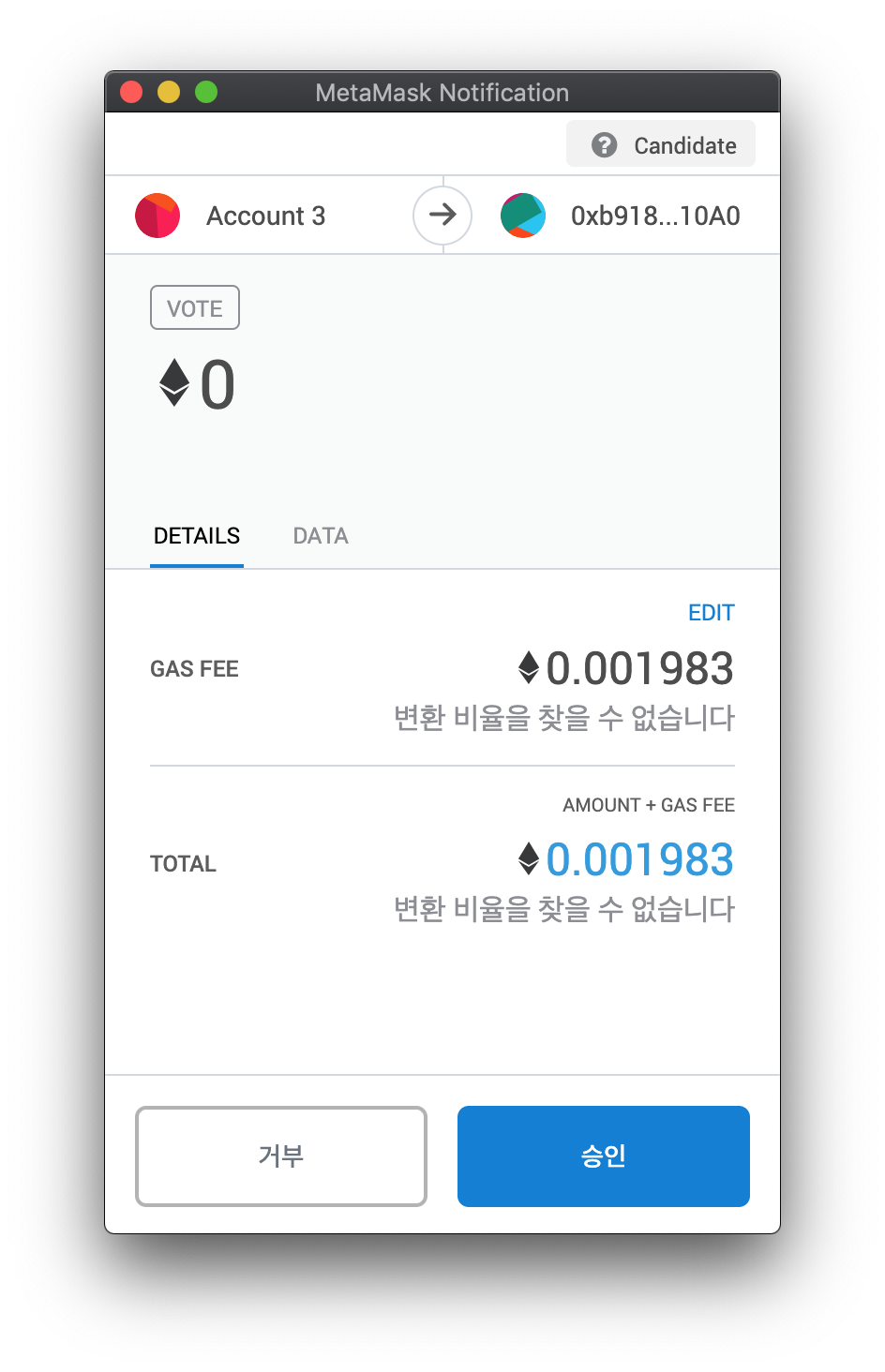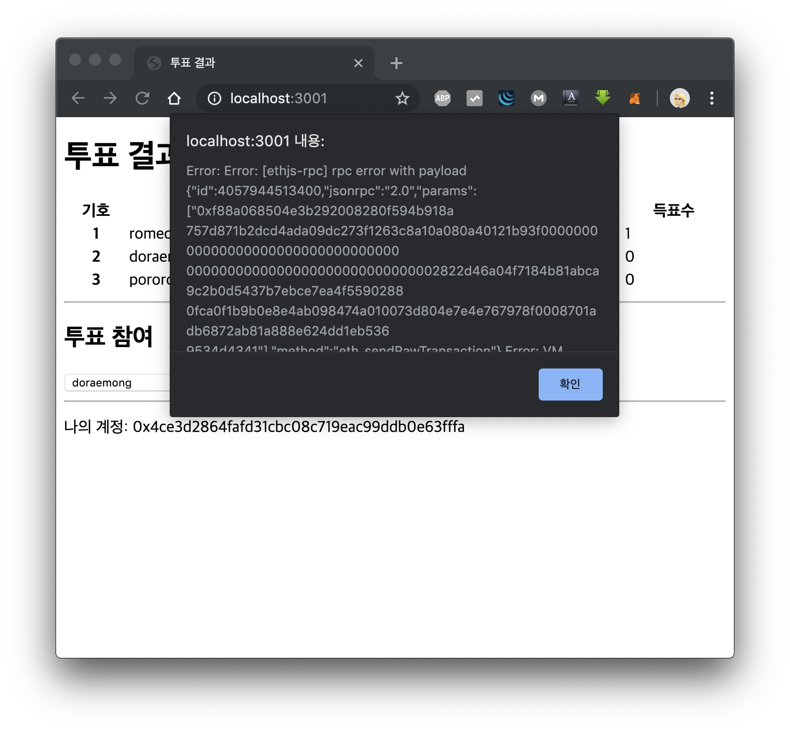 이번에는 MetaMask에서 투표 실패가 표시됩니다.