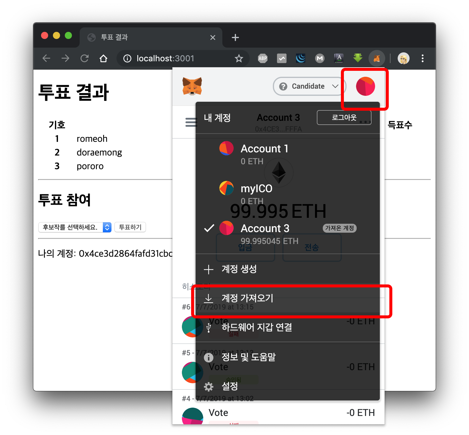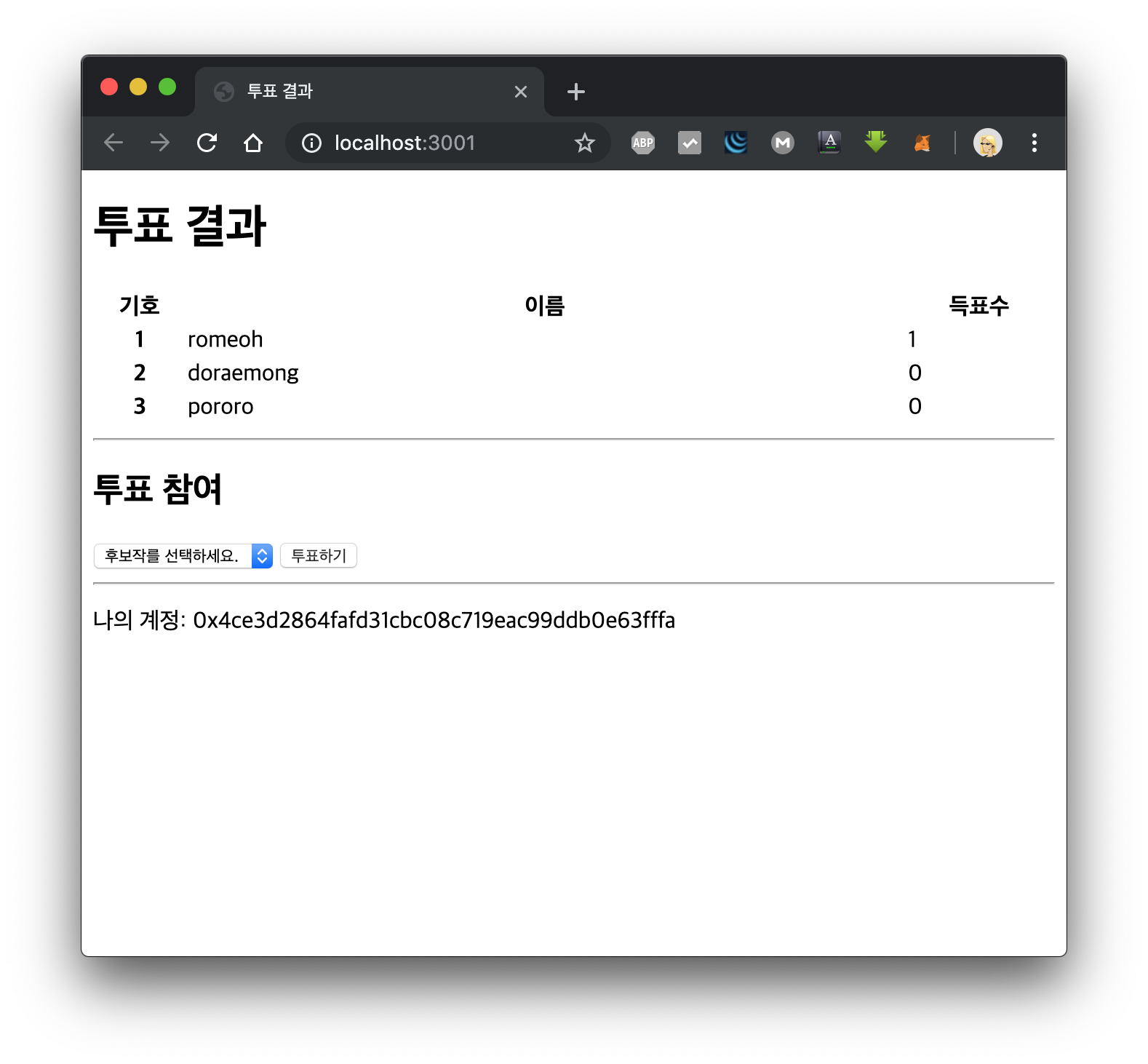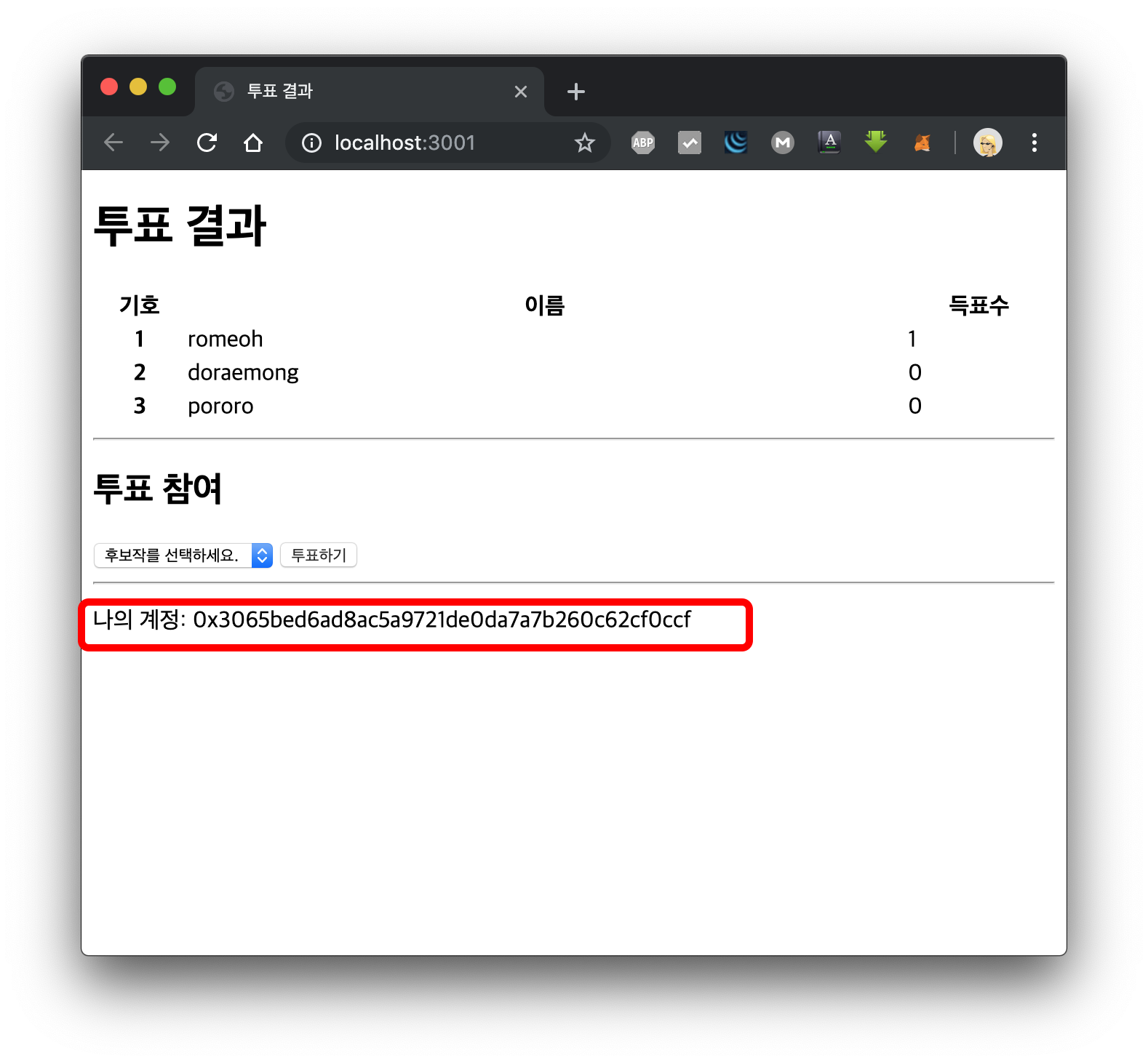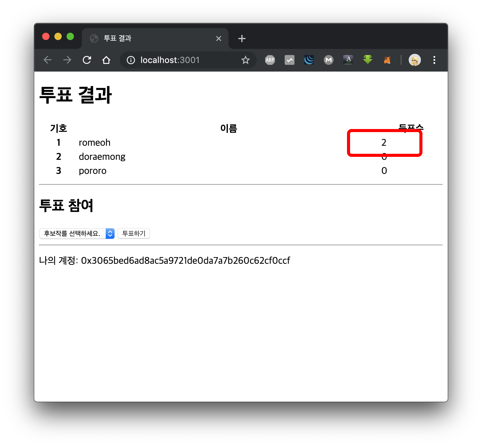 MetaMask 계정을 변경해서 다시 투표해보겠습니다.