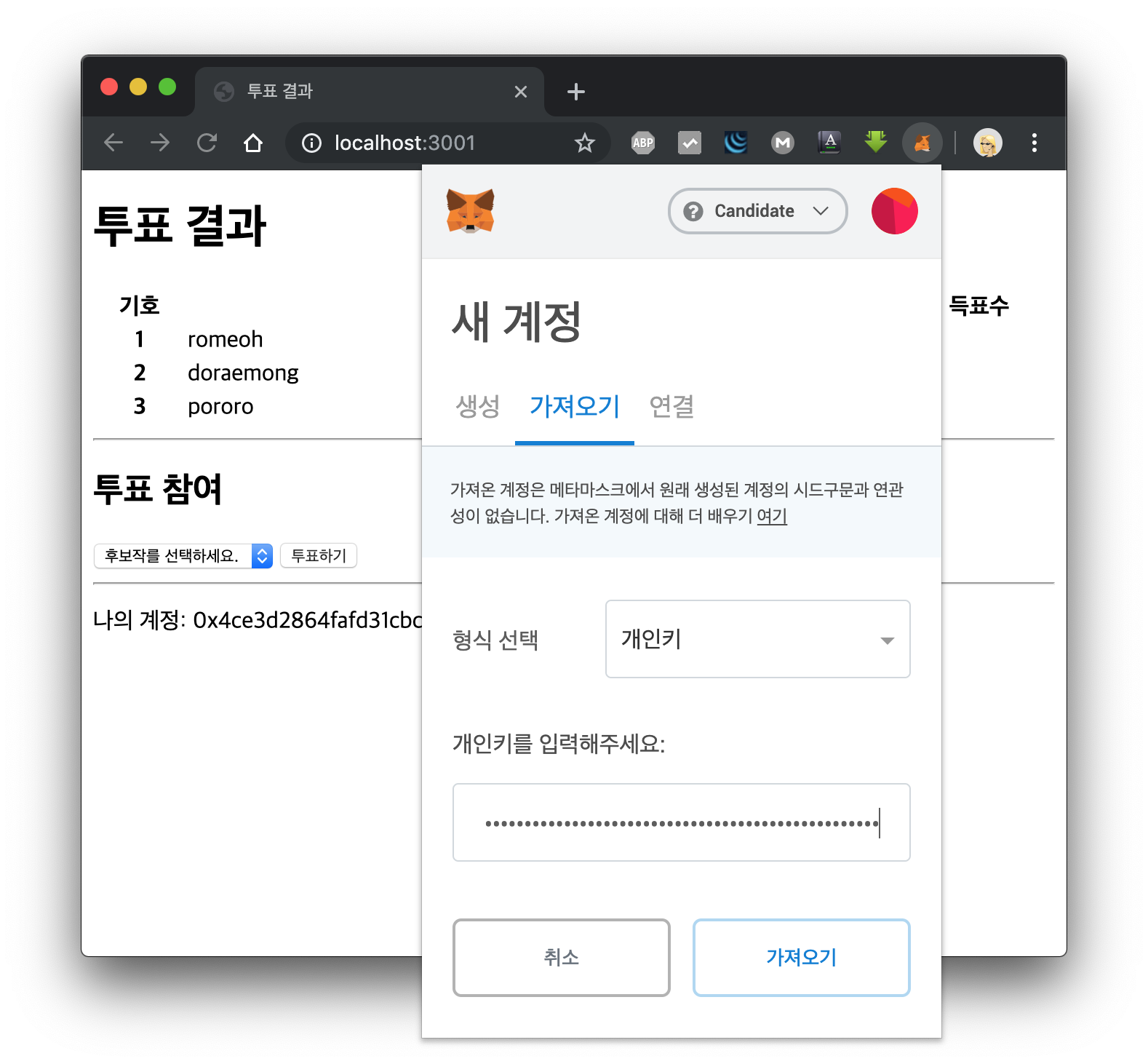 복사했던 private key를 개인키에 입력하고 가져오기 버튼을 누릅니다.