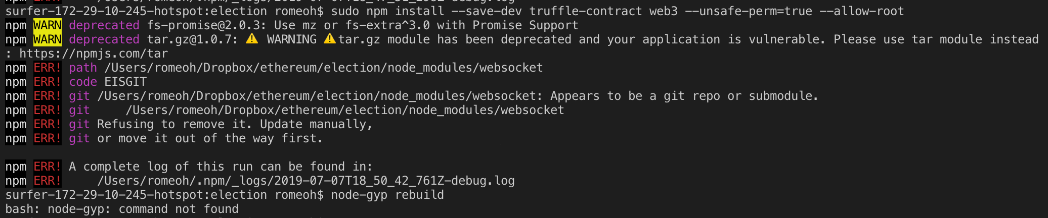 $ sudo npm install web3 --unsafe-perm=true --allow-root