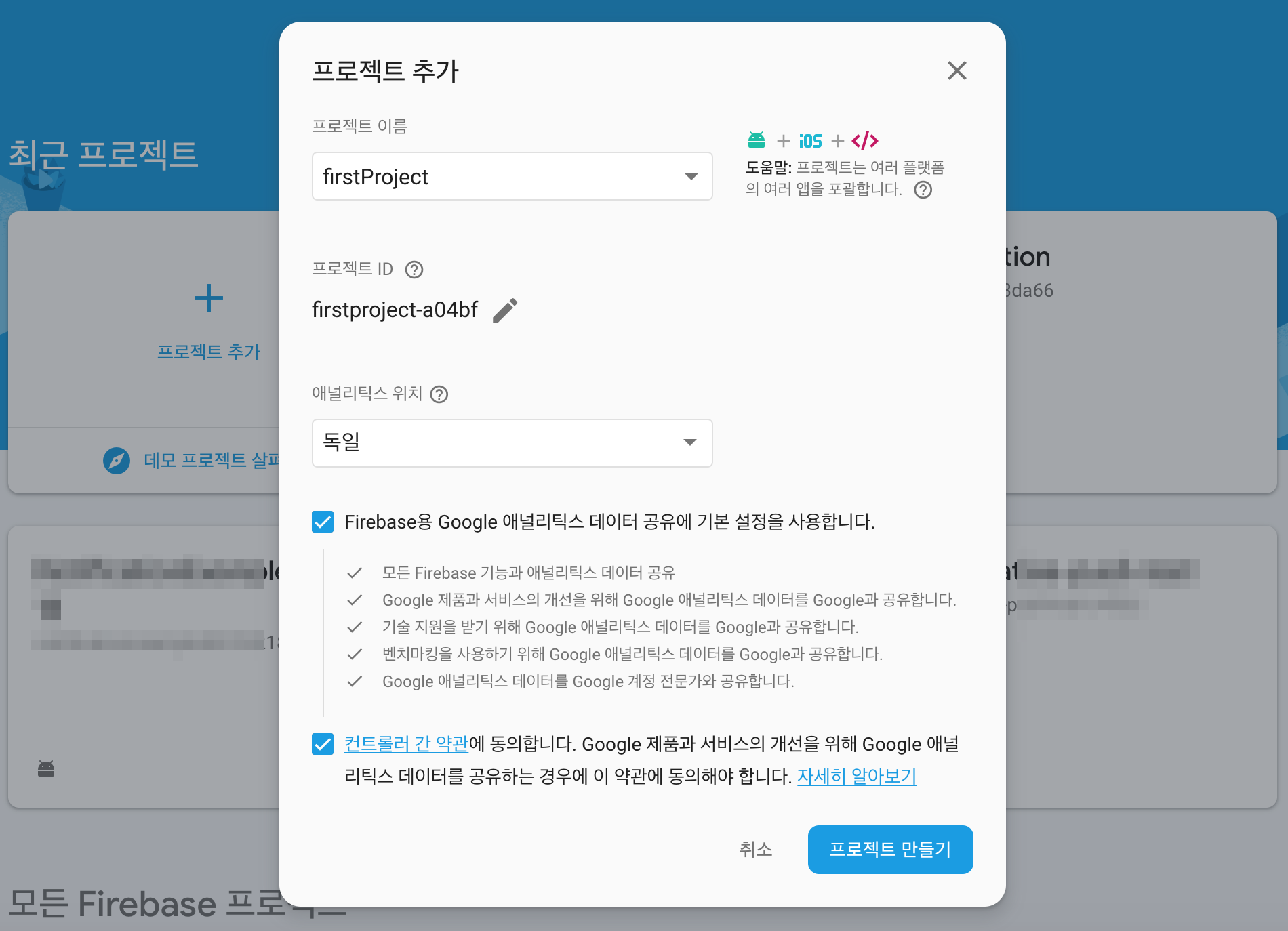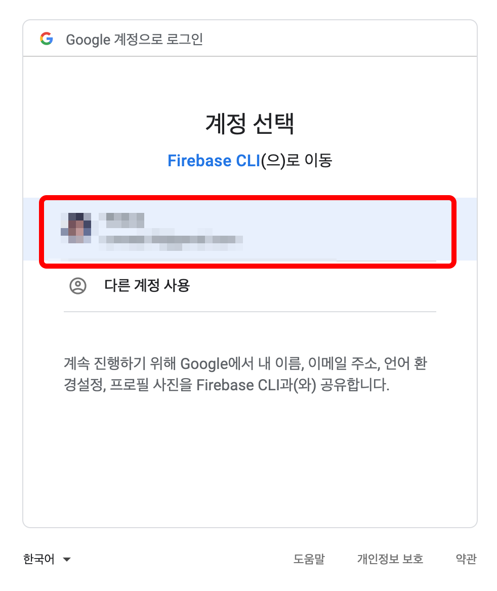 firebase에 로그인 되어 있으면 프로젝트를 선택할 수 있습니다.