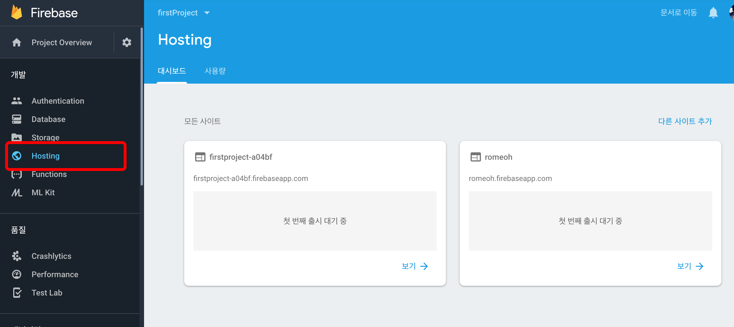 호스팅을 설정하면 romeoh.firebaseapp.com 형식으로 도메인이 생성됩니다.