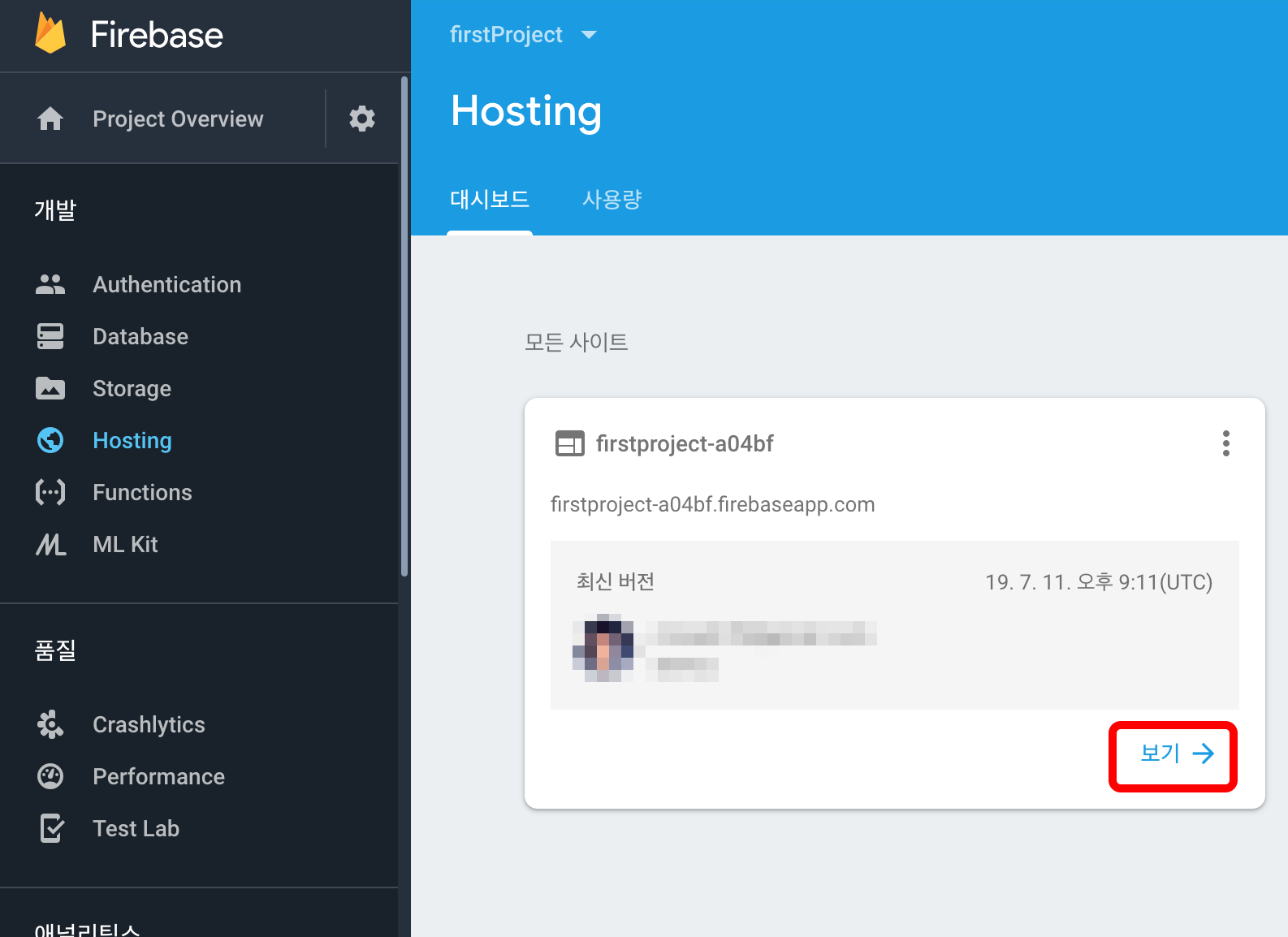 프로젝트가 생성되면 Hosting으로 이동합니다.