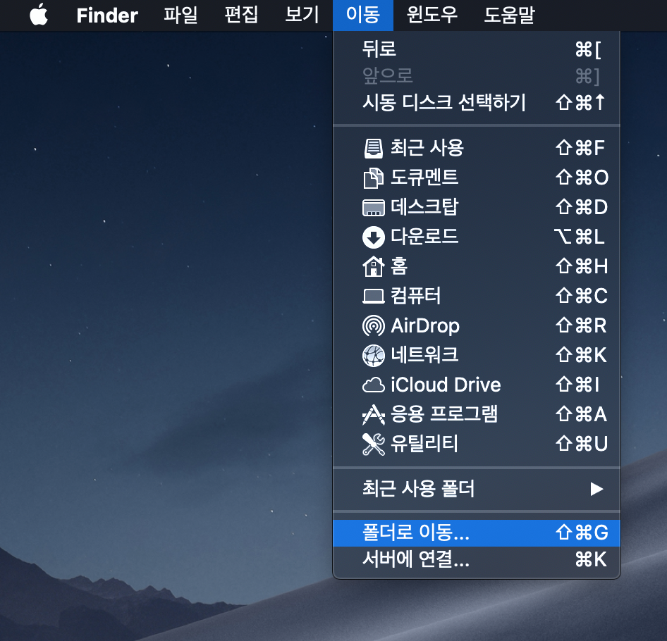 파인더에서 이동 > 폴더로 이동을 누릅니다.