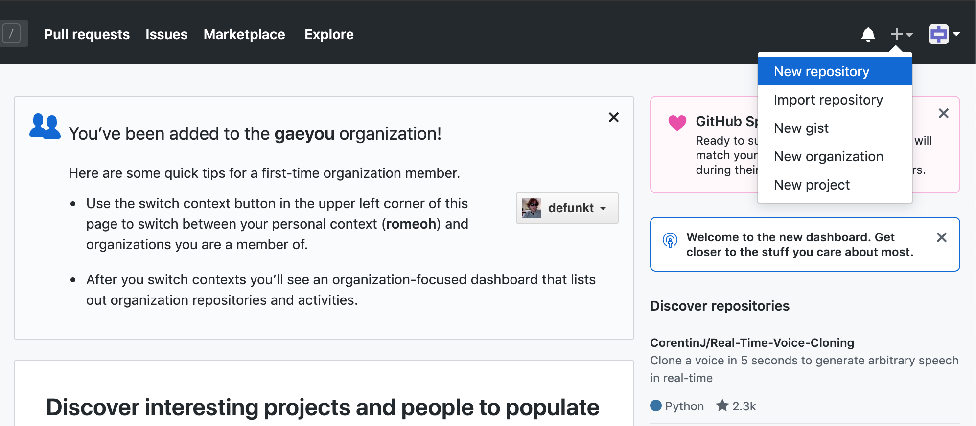 https://github.com 에서 로그인 하시고 New repository를 선택합니다.