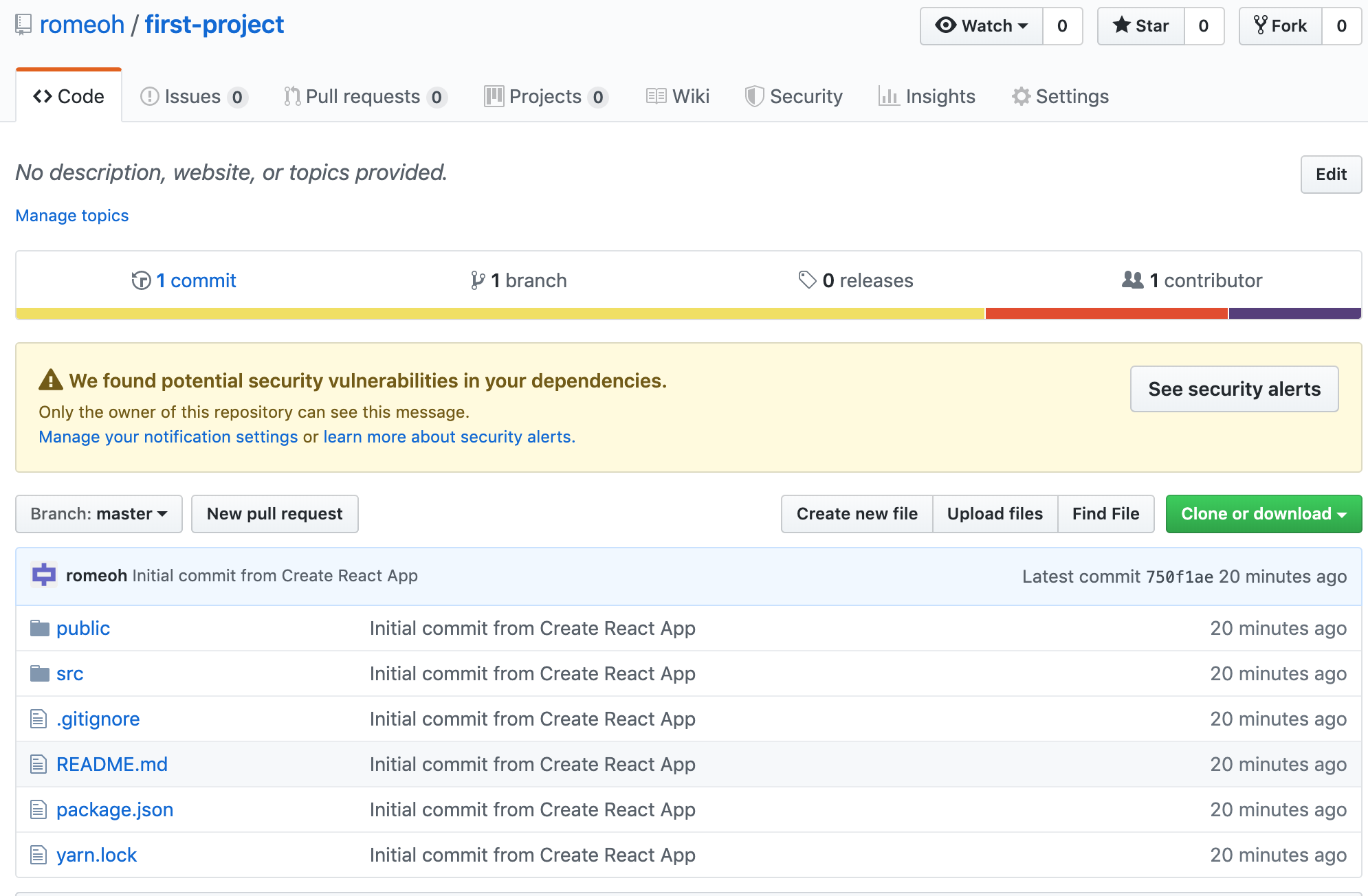 create-react-app으로 프로젝트를 생성하면 첫번째 커밋이 되어 있는 상태입니다.