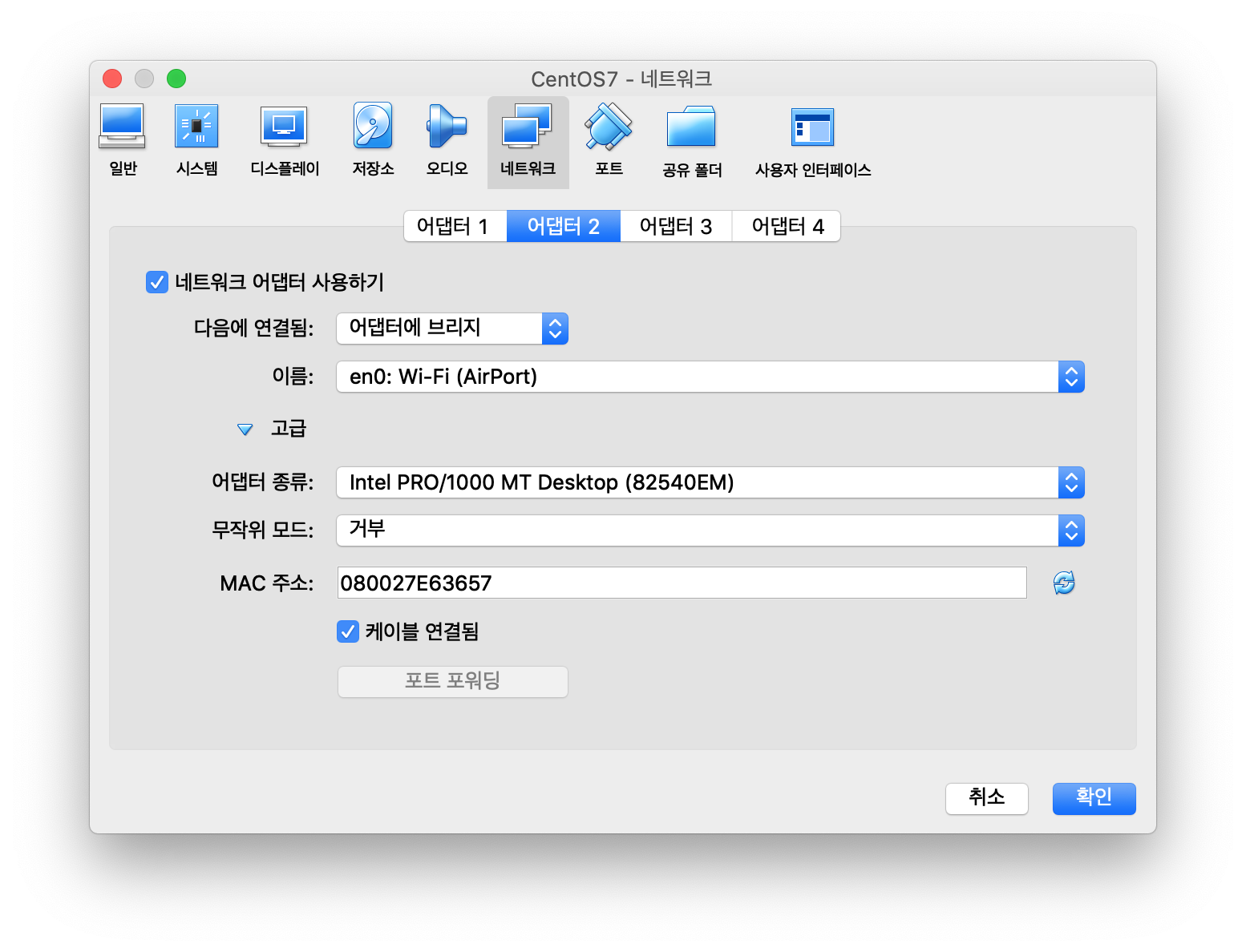 어댑터1은 CentOS가 인터넷에 접속할수 있는 네트워크입니다.