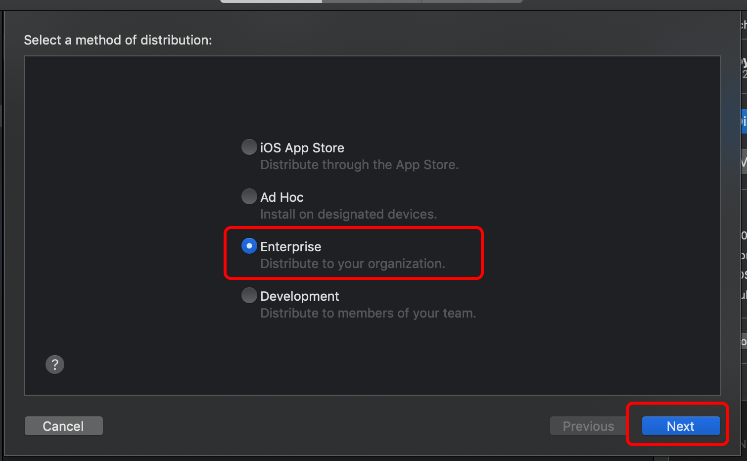 회사에서 Enterprise 계정을 구매하셨으면 여기서 Next만 누르면 바로 Export 버튼이 나오고 plist와 ipa 파일을 생성할 수 있습니다.