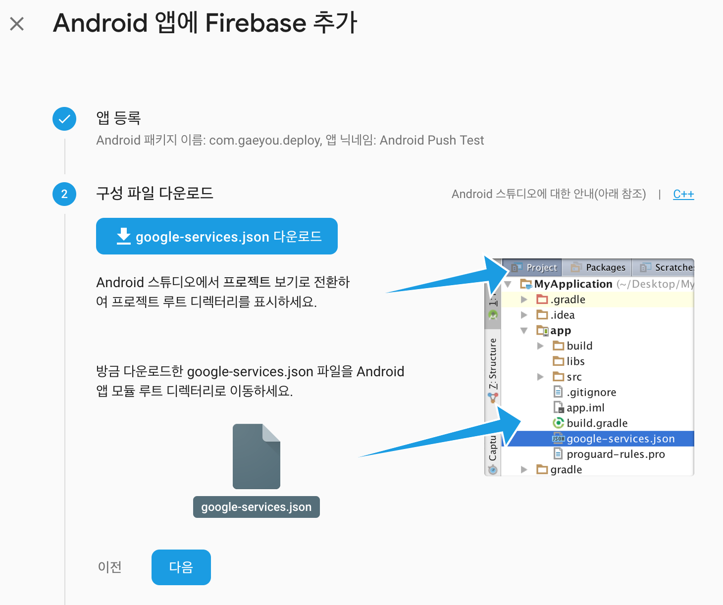 google-service.json 파일을 다운로드 받아서 app/폴더에 드래그해서 추가합니다.