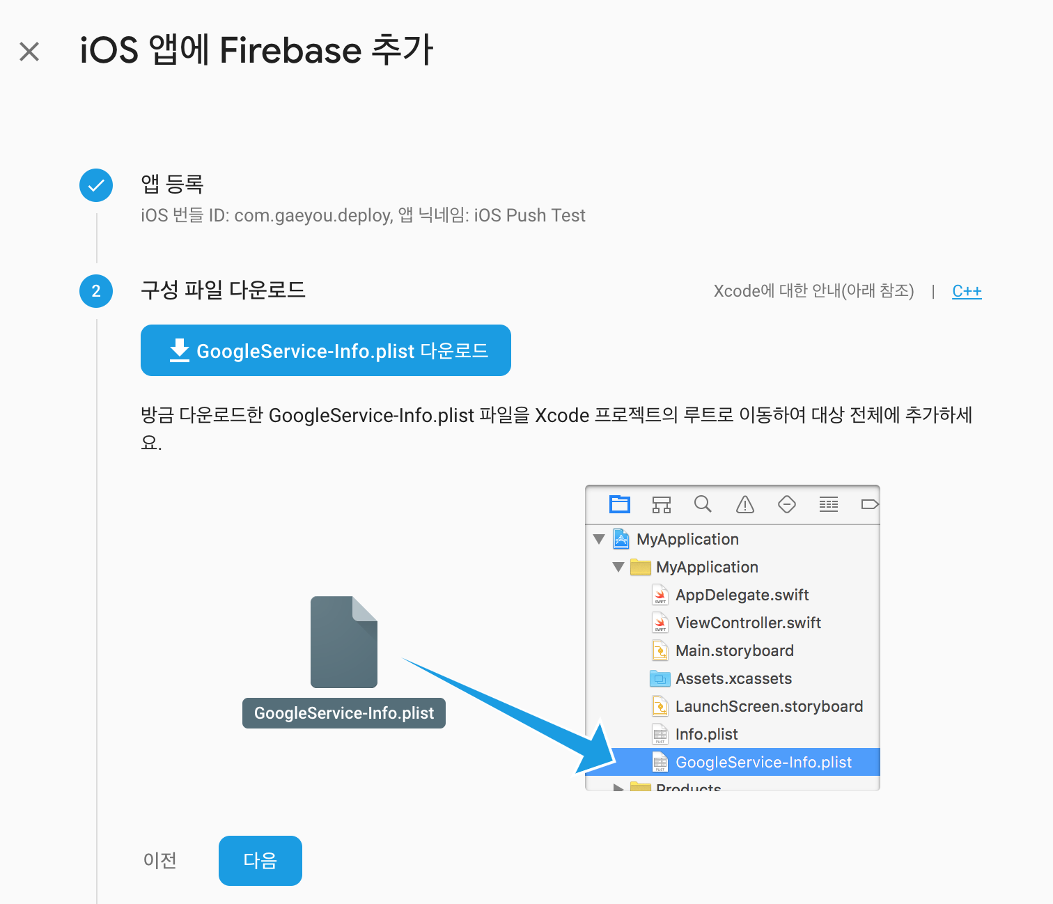 googleService-Info.json 파일을 다운로드해서 deployTest 프로젝트에 추가합니다.