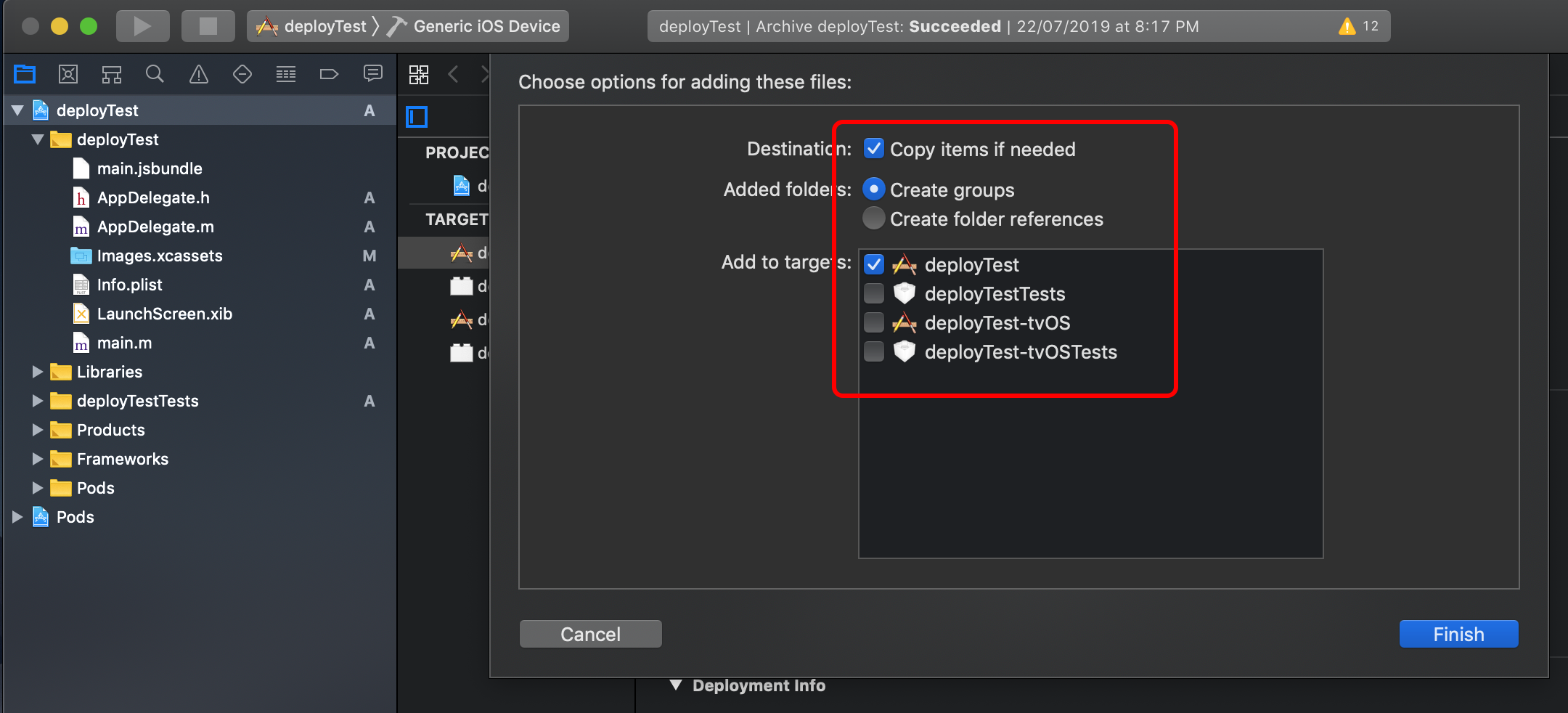 Xcode에서 프로젝트를 선택하고 Target > deployTest > General을 선택해서