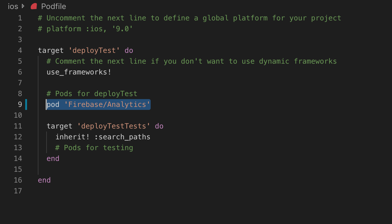 Podfile을 열어서 pod 'Firebase/Analytics' 을 추가합니다.