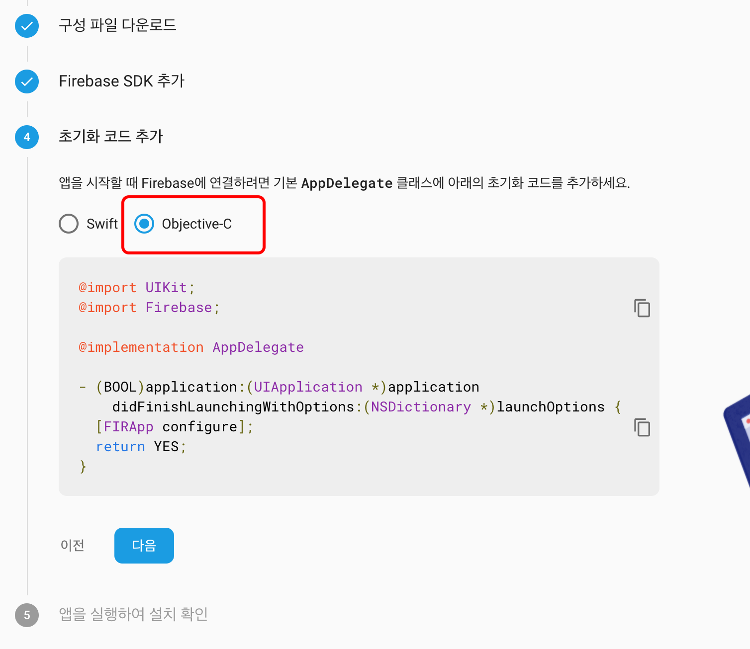 초기화 코드 추가에서 Objective-C를 선택하고 가이드대로 코드를 추가합니다.