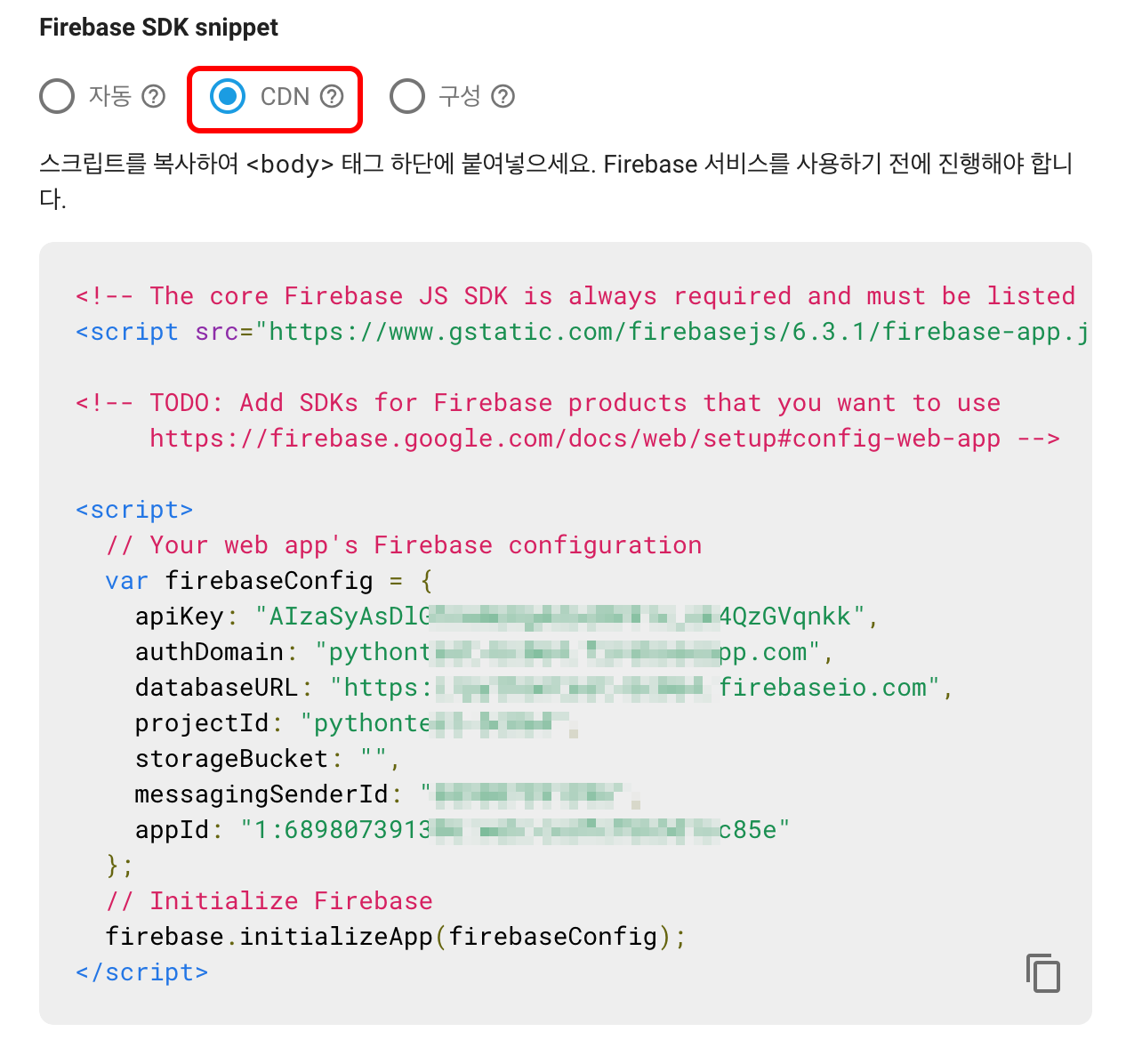 스크롤을 내려서 Firebase SDK snippet에서 CDN을 선택하고 firebaseConfig 부분을 복사해놓으세요.
