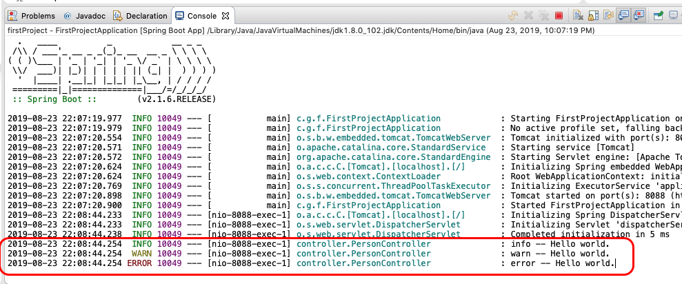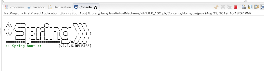 [2019-08-23 22:59:47:1306][main] INFO c.g.f.FirstProjectApplication - Started FirstProjectApplication in 1.193 seconds (JVM running for 1.665)
